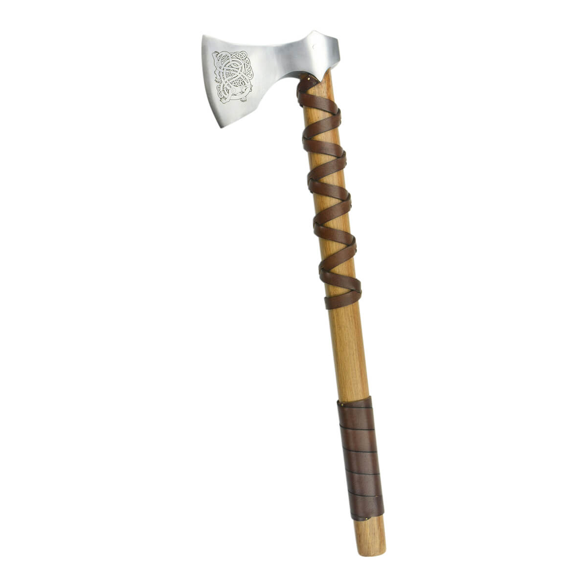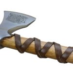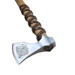 This Viking axe has a head which is crafted from high carbon steel which is etched on both sides with complex and ancient Norse knotwork. The haft is carved from robust hardwood and the axe is firmly seated and mounted directly onto the haft with a substantial rivet and it is then further reinforced with a steel axe wedge which is driven into the axe head socket to expand the wood for a very tight and permanent mounting.