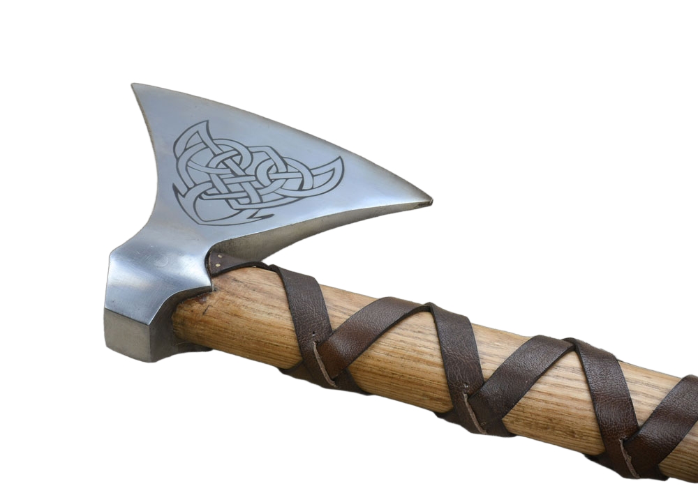 This Viking axe has a head which is crafted from high carbon steel which is etched on both sides with complex and ancient Norse knotwork. The haft is carved from robust hardwood and the axe is firmly seated and mounted directly onto the haft with a substantial rivet and it is then further reinforced with a steel axe wedge which is driven into the axe head socket to expand the wood for a very tight and permanent mounting.