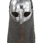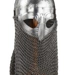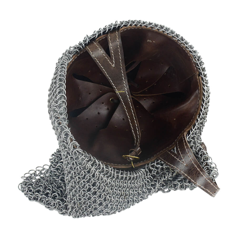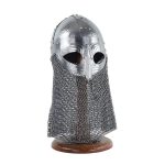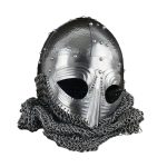 The Viking Vendel helm is constructed from 18 gauge steel and fitted with an integrated chainmail camail of butted mail links. The blackened interior has been fitted with an adjustable leather suspension liner and adjustable chin strap with brass buckle.