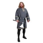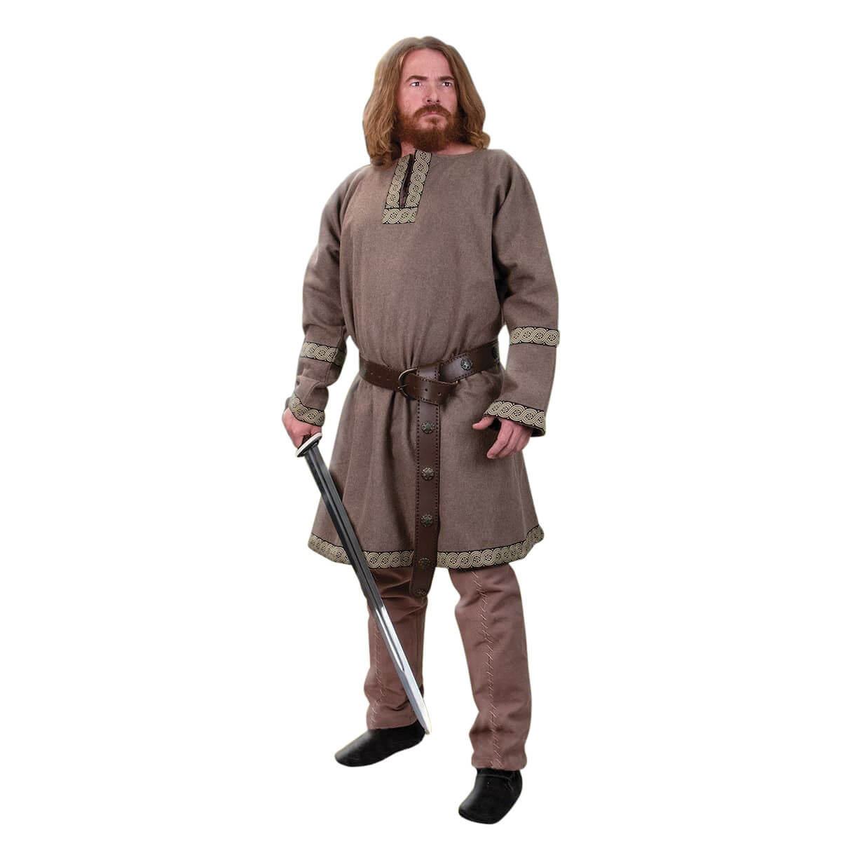 During the Norman and Saxon periods, men of all classes wore tunics. The Vikings’ tunics were cut as one piece, using one seam, and offered tremendous authority and ever present power to its owner. There was usually a slit at the front of the neckline as in this tunic, while both hems and sleeves were adorned with an attractive trim. On this Viking tunic, gold trim finishes the classic look of the tunic, which comes in green and brown depending one ones taste. These are the finest Viking tunics we have ever offered, made from 100% thick and comfortable wool, rich and heavy fabric commonly employed during these periods. For a luxurious selection of the finest in material and overall satisfaction, this Viking tunic offers tremendous power and authority to its owner.
