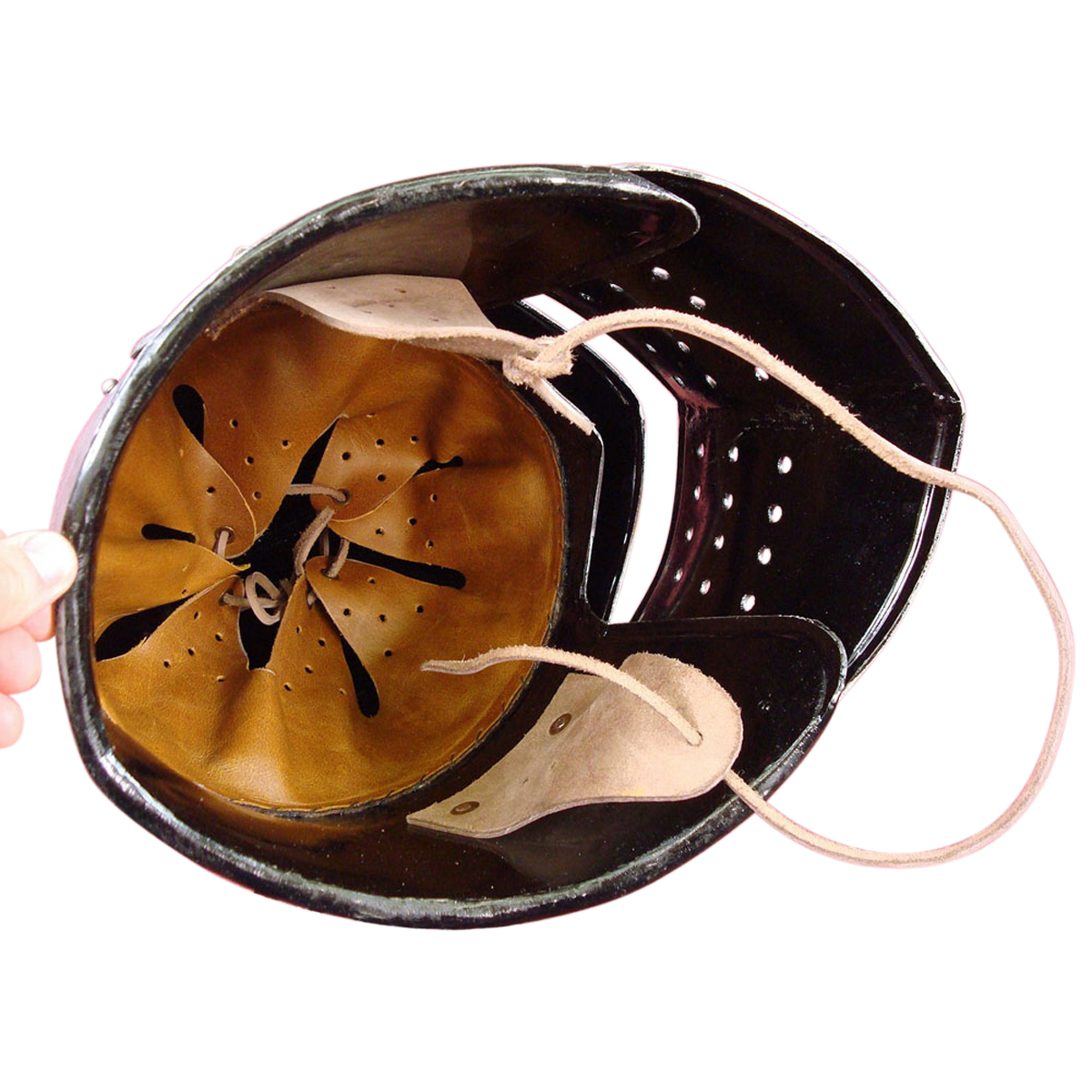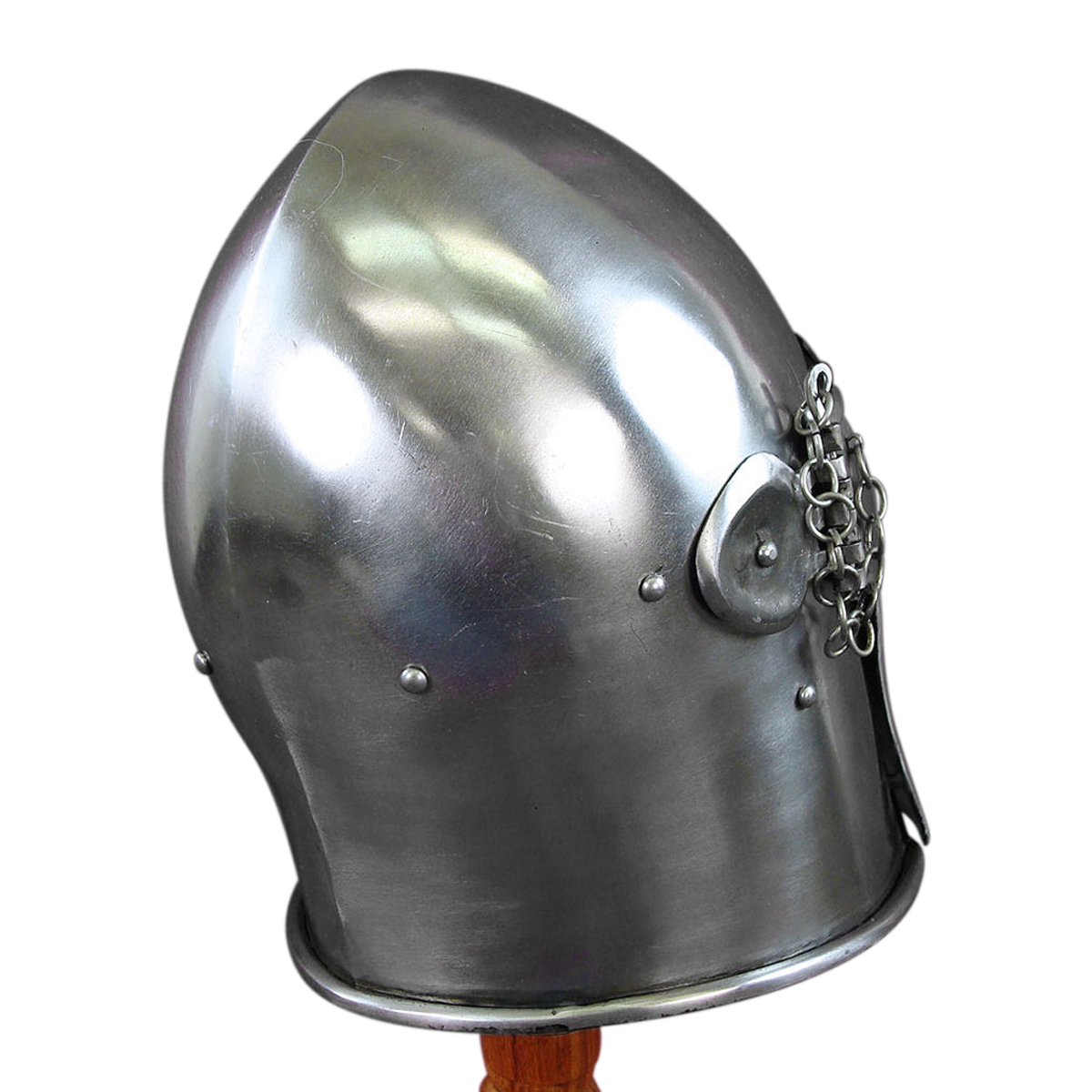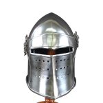 The Visored Bascinet is constructed from 14 gauge steel; the hinged visor can not only be raised, but removing the retaining pins can remove the visor entirely to convert the helm into a standard bascinet. The interior of the helm is blackened and lined with an adjustable, leather suspension liner. The helm has integrated leather cheek straps with a leather cord to affix the helm around the chin.