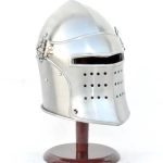 Maximize protection for your head with the stylish VisoredBascinet with Visor. Keeping with the traditional design that is characterized by a more pointed apex to the skull with a downward extension in the rear, this piece features 14 gauge steel construction with a blackened interior and leather suspension liner. It is highlighted by a visor that can be raised and removed by taking out the retaining pins. To ensure a perfect fit, integrated leather cheek straps and a leather cord for the chin are included. Great for costumes and re-enactments.