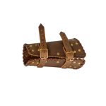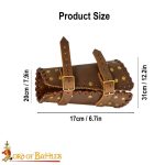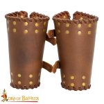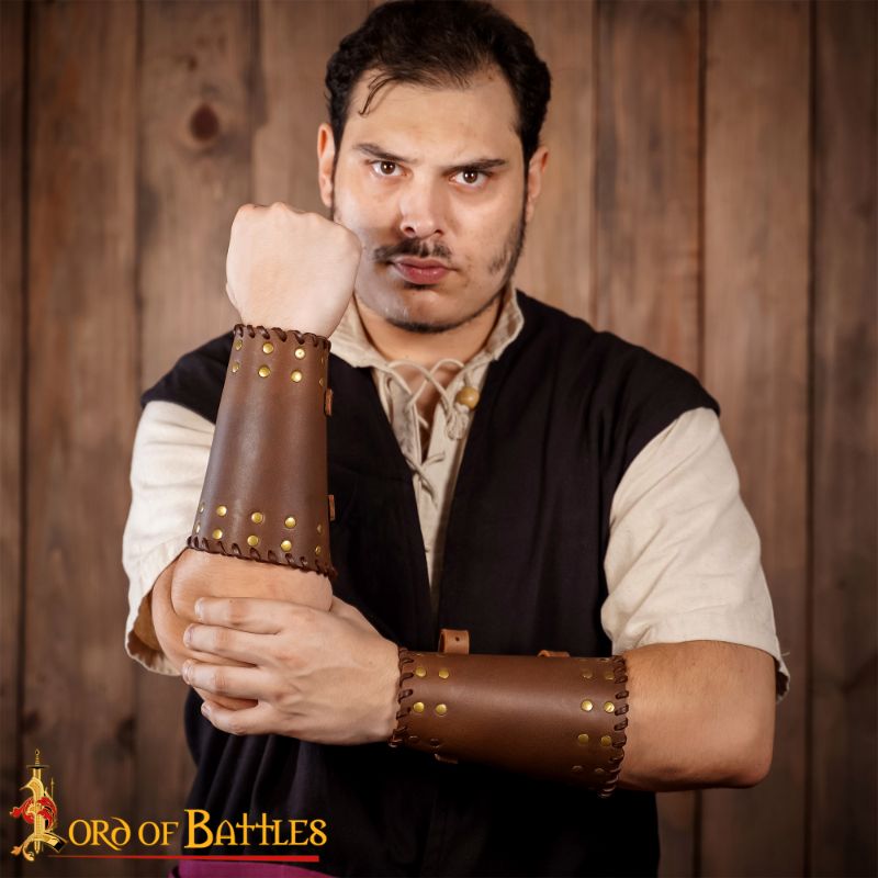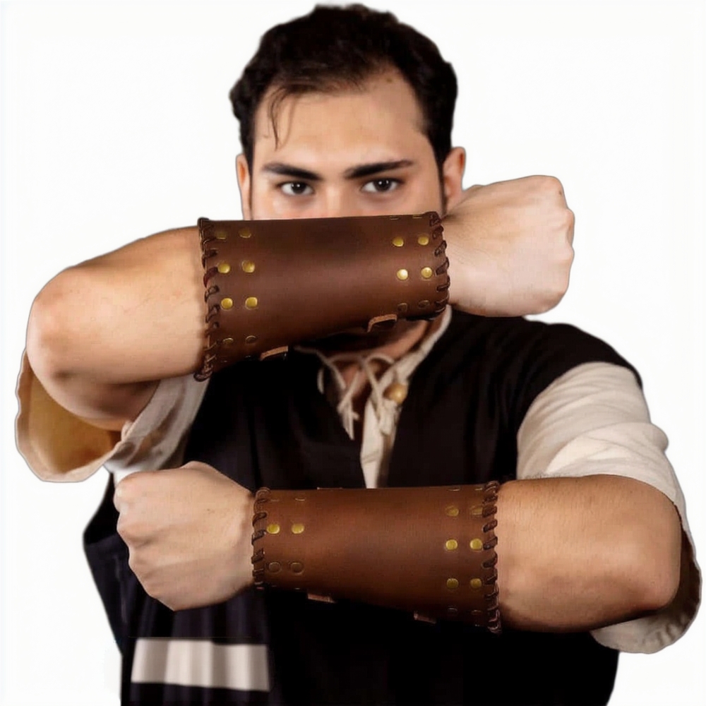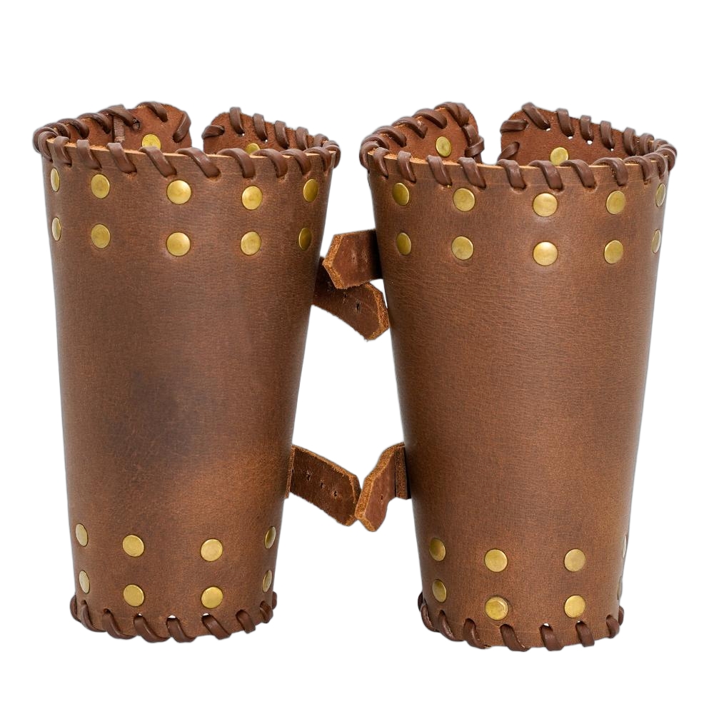 These bracers are artistically handcrafted from robust genuine buff leather. For an adjustable fit, a pair of genuine leather straps with pure brass buckles is provided. Each bracer has a length of approx. 17 cm, upper width of approx. 31 cm, and lower width of approx. 20 cm.