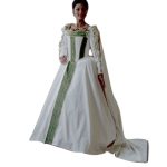 This Toledo gown has its root deep into the Italian Medici Family. With a name from Grand duchess Eleanor, the pure cotton velvet masterpiece sports layers of colored satin. To reflect the unique detailed fashion taste of the Medici Duchess, the gown also has some adornments and notable 28 marching pearl buttons on the sleeves. With the sleeves release to reveal its silk blouse and the illusion of a slim waistlines fostered but the Bumroll, the floor length hoopskirt and the rolled out chest line corset, it is not har to see why the deceased wife of Grand Duke Cosimo would want to sleep in it forever.