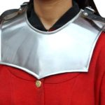 The Woman’s Gorget was once a linen wrap that ladies wore around their neck before it came to be known as a piece of armor. As time went on and the need for neck protection surfaced, the gorget shifted from being a cloth piece to a steel or leather one. Designed with historical style, this armor features 20 gauge steel plates with a blackened interior. These plates fit around the neck with adjustable steel buckles and leather straps. In addition, attachment to pauldrons is enabled with the inclusion of leather shoulder straps. Great for costumes and re-enactments. 11 1/4” Wide