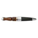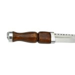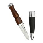This Scottish Sgian Dubh has a blade of high carbon steel which is mounted into a hilt of carved wood with cast metal accent and fittings. Included is a wood scabbard which is wrapped in leather and completed with metal fittings.