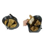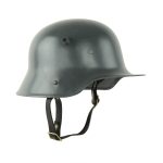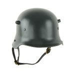 This reproduction the German WW1 Stahlhelm is constructed from 18 gauge steel and finished with the original period field gray finish. The interior of the helm has an adjustable leather suspension liner complete with padded inserts sewn behind the leather liner panels. The chin strap is leather with brass hardware.