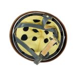 This WWII German Paratrooper Helmet has been artificially aged to give it an antiqued appearance. It has a shell of steel with a rusted finish. The interior of the helmet is well padded with firm foam and a liner of leather. The chinstrap is leather with steel buttons.