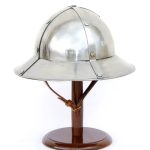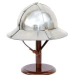 Maximize your head protection with this stylish medieval XIII Century Kettle Helm. Keeping in line with the traditional design that resembles a cooking pot with a wide brim, this piece features 14 gauge steel construction with a blackened interior which contains a leather suspension liner and an adjustable leather chin strap and brass buckle to ensure a secure fit. Authentic in appearance, this helmet is great for costumes and re-enactments and sure to be a favorite with medieval enthusiasts.